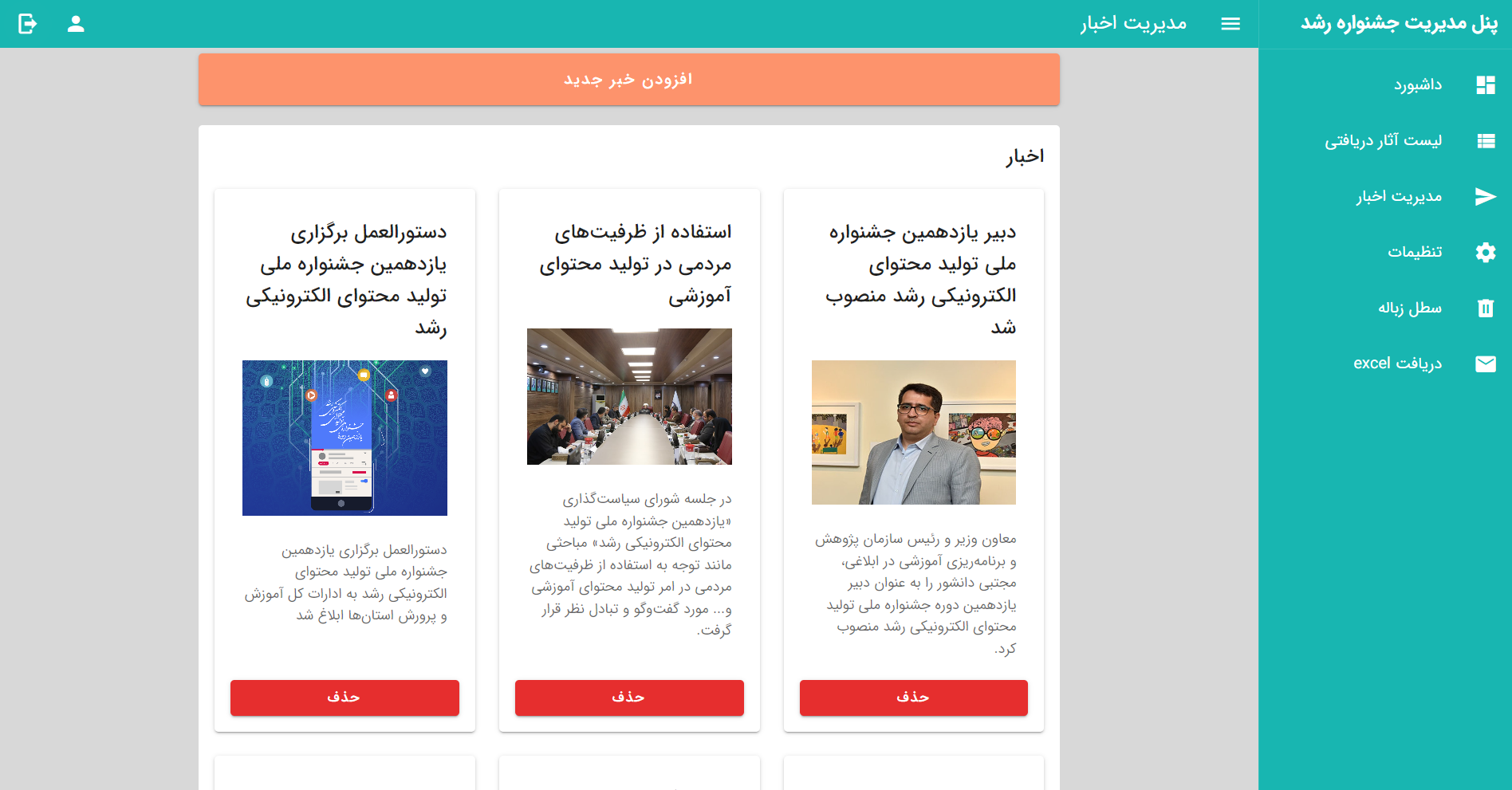 افزودن، ویرایش و حذف اخبار در پنل ادمین میسر است.